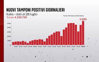 Sono 5.696 i nuovi contagi Covid registrati in Italia dal ministero della Salute nel bollettino del 28 luglio. I casi totali da inizio pandemia sono 4.330.739