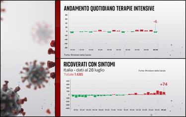 Aumenta il numero dei pazienti nei reparti ordinari (1.685). Diminuiscono le persone in rianimazione (183), ma si registrano 9 ingressi in 24 ore. La percentuale di positivi sui tamponi fatti è al 2,3%, con il bollettino del 28 luglio che segnala 5.696 nuovi casi rilevati su 248.472 test giornalieri