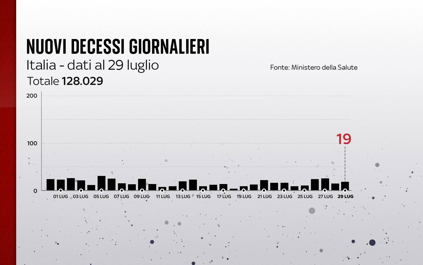 In Italia, dall'inizio della pandemia, le persone risultate positive al coronavirus, compresi guariti e deceduti, sono 4.336.906. Le vittime in totale sono 128.029, con 19 decessi nelle ultime 24 ore. I guariti in totale sono 4.130.393. I ricoverati con sintomi sono 1.730 (+45). Sono invece 76.560 le persone in isolamento domiciliare. I tamponi sono in tutto 77.031.848 - di cui 54.294.154 processati con test molecolare e 22.737.694 con test antigenico rapido -, in aumento di 224.790 rispetto al 28 luglio. Le persone testate sono finora 30.853.645, al netto di quanti tamponi abbiano fatto.