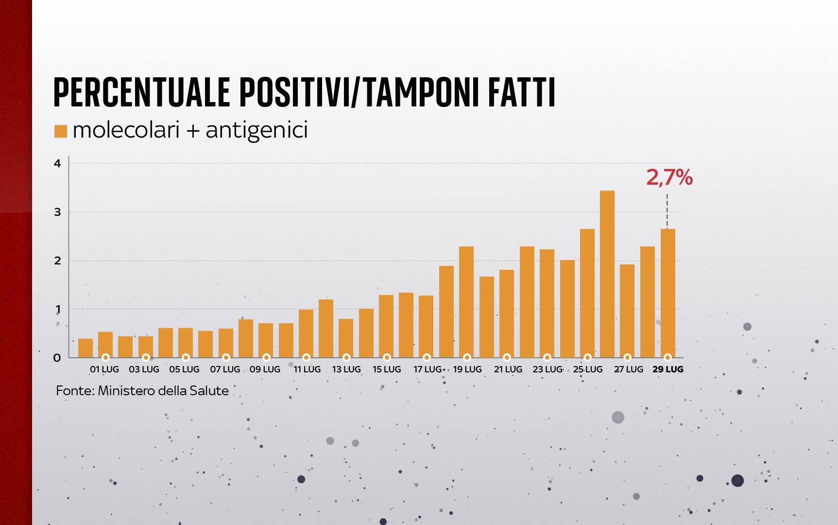 Sono 6.171 i nuovi contagi di Covid-19 in Italia (ieri 5.696), a fronte di 224.790 tamponi giornalieri effettuati (ieri 248.472). La percentuale di positivi considerando il totale dei tamponi è al 2,7% (ieri 2,3%). Sono 19 le vittime registrate in un giorno. Le terapie intensive sono 194 (+11), con 20 nuovi ingressi nelle ultime 24 ore. È questo il quadro che emerge dal bollettino del ministero della Salute del 29 luglio sulla situazione coronavirus in Italia (AGGIORNAMENTI LIVE - SPECIALE - LA SITUAZIONE IN ITALIA CON MAPPE E INFOGRAFICHE - DATI E GRAFICI SUI VACCINI).