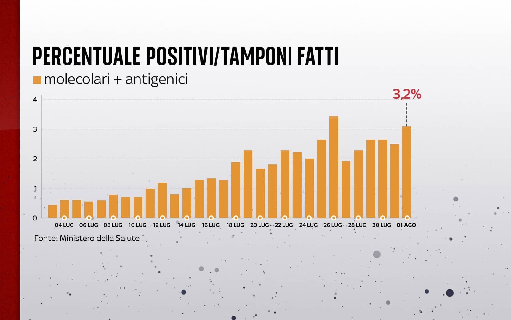 Sono 5.321 i nuovi contagi di Covid-19 in Italia (ieri 6.513), a fronte di 167.761 tamponi giornalieri effettuati (ieri 264.860). La percentuale di positivi considerando il totale dei tamponi è al 3,2% (ieri al 2,5%). Sono 5 le vittime registrate in un giorno. Le terapie intensive sono 230 (+16), con 22 nuovi ingressi nelle ultime 24 ore. È questo il quadro che emerge dal bollettino del ministero della Salute dell'1 agosto sulla situazione coronavirus in Italia (AGGIORNAMENTI LIVE - SPECIALE - LA SITUAZIONE IN ITALIA CON MAPPE E INFOGRAFICHE - DATI E GRAFICI SUI VACCINI).