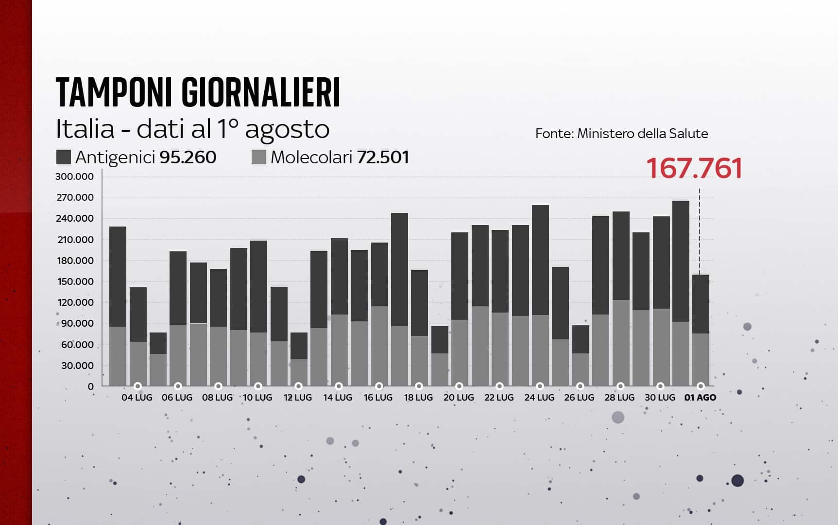 I tamponi giornalieri effettuati sono 167.761, compresi i test rapidi. La percentuale dei positivi è al 3,2%. Le vittime sono 128.068 in totale, mentre le terapie intensive sono 230 (+16), con 22 ingressi nelle ultime 24 ore. I casi totali, compresi morti e guariti, raggiungono quota 4.355.348