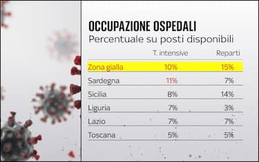 Per quanto riguarda l’occupazione degli ospedali, le soglie fissate per il passaggio alla zona gialla sono del 10% in terapia intensiva e del 15% nei reparti ordinari. Al momento solo la Sardegna è all’11% per quanto riguarda la rianimazione, mentre per gli altri reparti nessuna regione supera la soglia (ci si avvicina la Sicilia con il 14%)