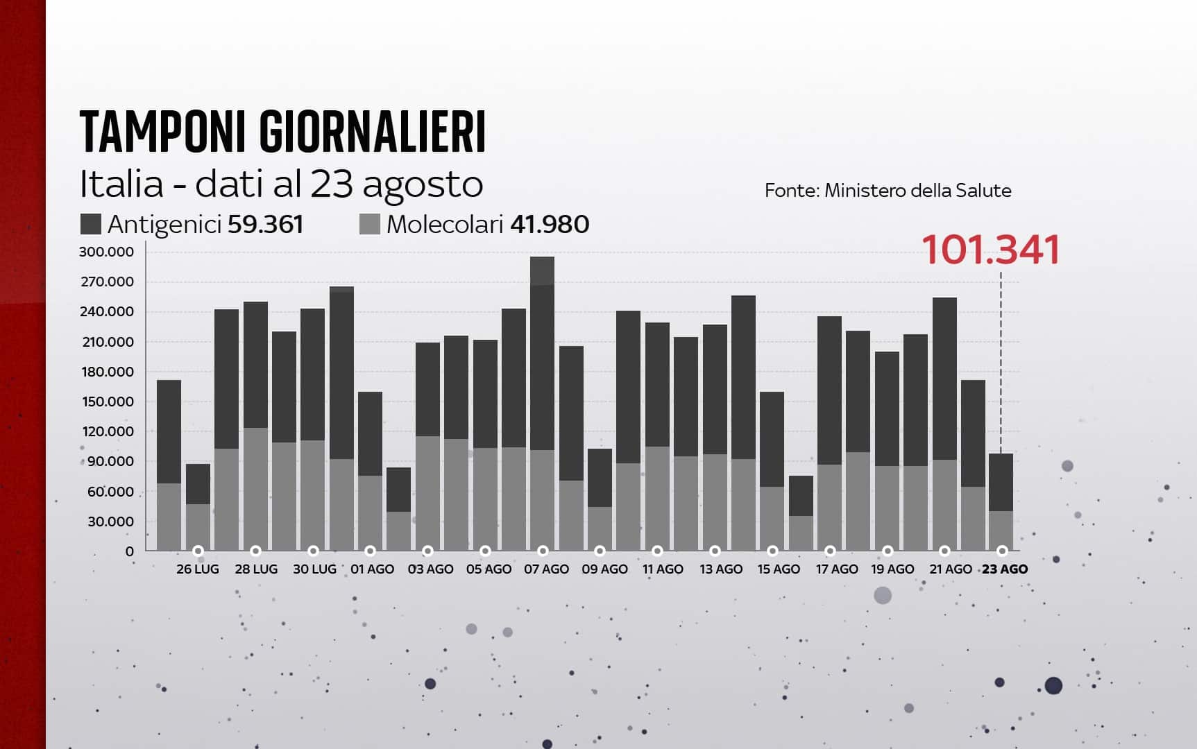 In Italia, dall'inizio della pandemia, le persone risultate positive al coronavirus, compresi guariti e deceduti, sono 4.488.779. Le vittime in totale sono 128.795, con 44 decessi registrati nelle ultime 24 ore. I guariti sono un totale di 4.224.429. I ricoverati con sintomi sono 3.928 (+161). Sono invece 131.142 le persone in isolamento domiciliare. I tamponi sono in tutto 82.104.705 - di cui 56.364.064 processati con test molecolare e 25.740.641 con test antigenico rapido -, in aumento di 101.341 rispetto al 22 agosto. Le persone testate sono finora 32.098.419, al netto di quanti tamponi abbiano fatto.