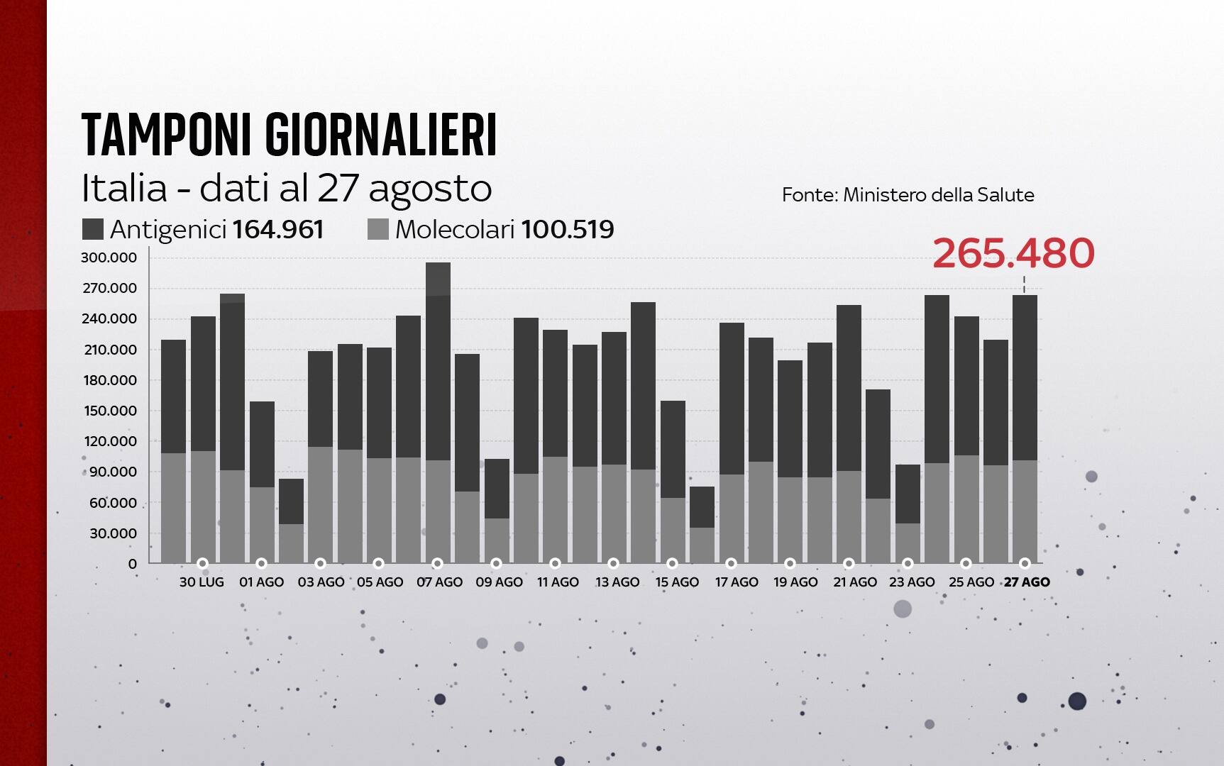 In Italia, dall'inizio della pandemia, le persone risultate positive al coronavirus, compresi guariti e deceduti, sono 4.517.434. Le vittime in totale sono 129.002, con 45 decessi registrati. I guariti sono un totale di 4.250.314. I ricoverati con sintomi sono 4.114 (+55). Sono invece 133.493 le persone in isolamento domiciliare. I tamponi sono in tutto 83.101.723 - di cui 56.770.912 processati con test molecolare e 26.330.811 con test antigenico rapido -, in aumento di 265.480 rispetto al 26 agosto. Le persone testate sono finora 32.326.275, al netto di quanti tamponi abbiano fatto.