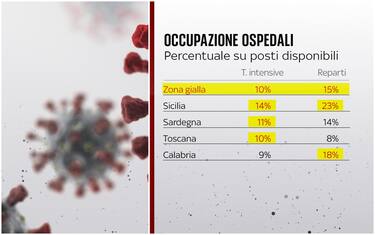 La soglia di occupazione dei posti letto in terapia intensiva del 10% e quella dell'area medica del 15% sono due dei parametri che fanno sì che le regioni italiane passino dalla zona bianca a quella gialla (come già accaduto per la Sicilia). Secondo gli ultimi dati disponibili, proprio i numeri della Sicilia superano ancora la soglia fissata sia per quanto riguarda le rianimazioni sia per i ricoveri ordinari. A rischio ci sono Sardegna, Toscana e Calabria