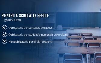 Tornano oggi a scuola gli studenti di gran parte d'Italia. Tra Green Pass, mascherine, test salivari, finestre aperte o impianti di areazione, sono diverse le misure messe in campo dal governo per contrastare il rischio di contagio da coronavirus nell'anno che vede il ritorno in presenza al 100%. Ecco tutte le regole previste