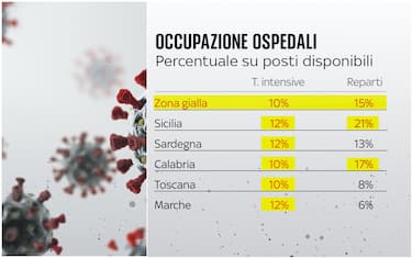 Si passa da zona bianca a zona gialla quando: l'incidenza settimanale dei contagi è pari o superiore a 50 ogni 100.000 abitanti per 3 settimane consecutive; il tasso di occupazione dei posti letto in area medica è superiore al 15% e il tasso di occupazione dei posti letto in terapia intensiva per pazienti affetti da Covid-19 è superiore al 10%. Ecco quali sono le regioni con i dati peggiori a livello percentuale, secondo l'ultimo aggiornamento di Agenas. L'ordine seguito è dato dall'occupazione delle terapie intensive