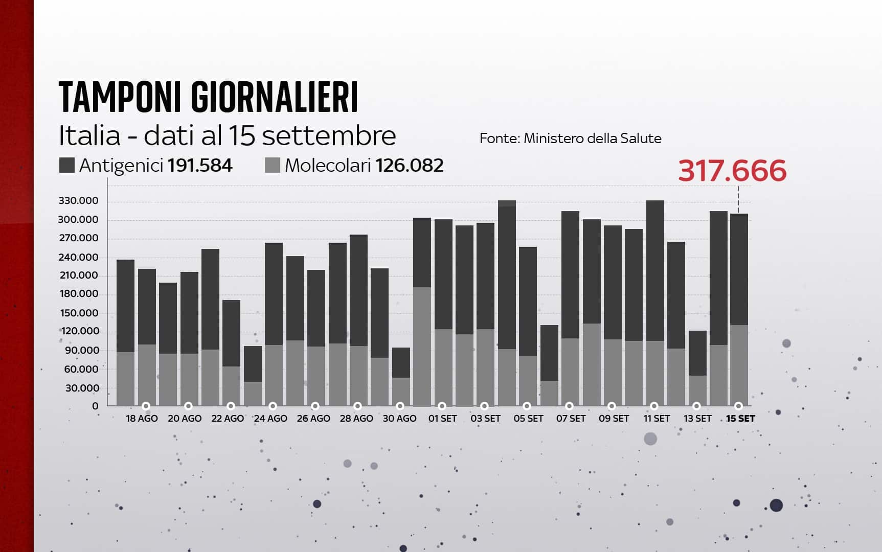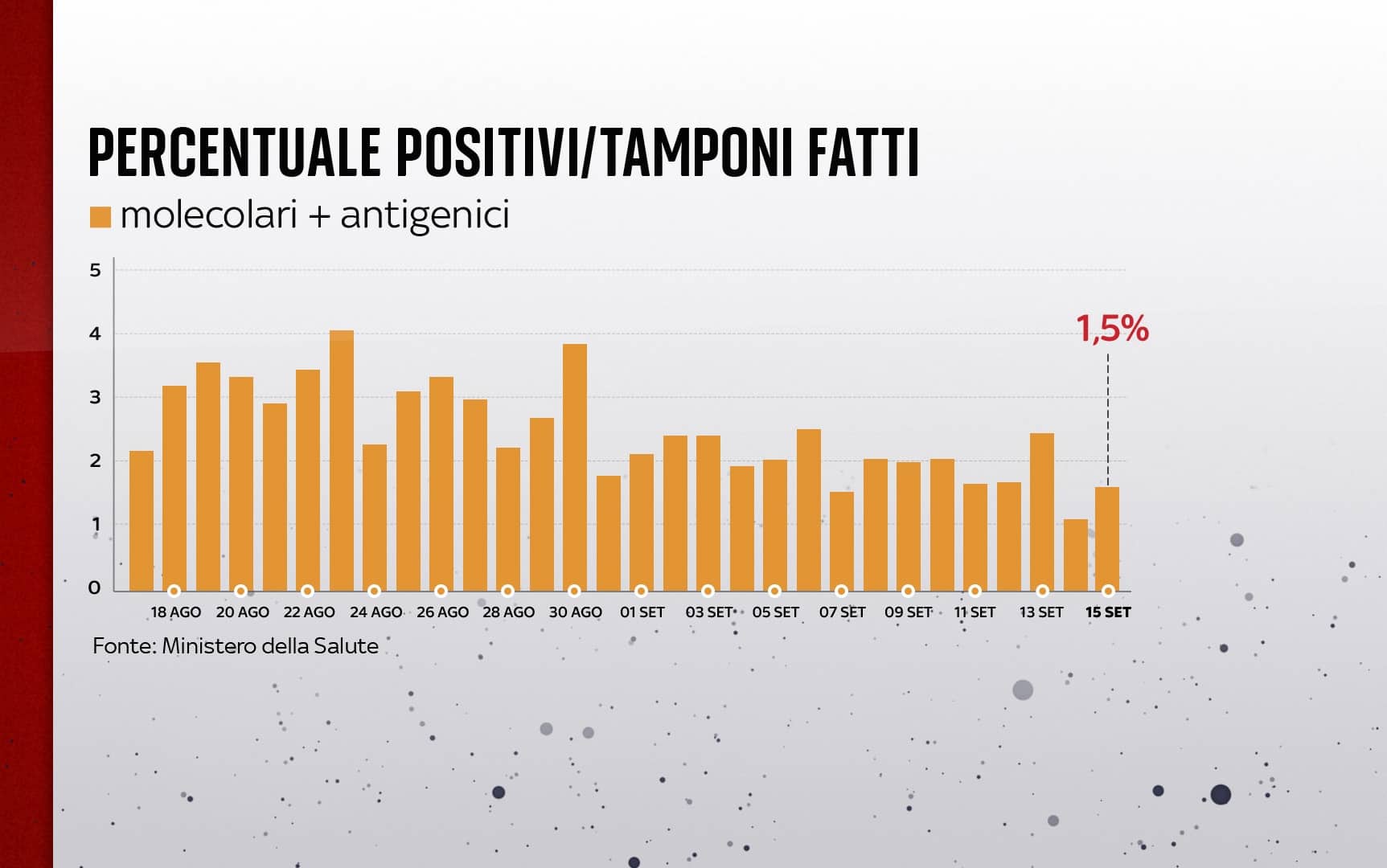 In Italia, dall'inizio della pandemia, le persone risultate positive al coronavirus, compresi guariti e deceduti, sono 4.618.040. Le vittime in totale sono 130.100. I guariti sono un totale di 4.369.453. I ricoverati con sintomi sono 4.128 (-37). Sono invece 113.819 le persone in isolamento domiciliare. I tamponi sono in tutto 88.210.140 - di cui 58.633.294 processati con test molecolare e 29.576.846 con test antigenico rapido -, in aumento di 317.666 rispetto al 14 settembre. Le persone testate sono finora 33.423.482, al netto di quanti tamponi abbiano fatto.