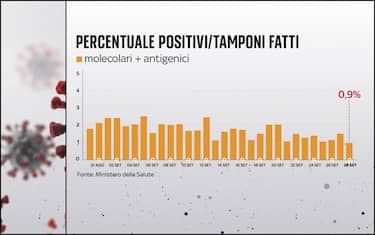 La percentuale dei positivi sui tamponi giornalieri effettuati scende sotto l’1%: il dato è allo 0,9%