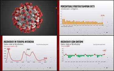 Salgono il numero dei pazienti nei reparti ordinari (2.428, +42) e quello delle persone in rianimazione (358, +9). Stabile la percentuale di positivi sui tamponi fatti (ieri 0,6%). Il bollettino del 18 ottobre segnala 1.597 nuovi casi rilevati su 219.878 test giornalieri