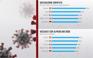 Se si guarda ai vaccinati con almeno una dose, la Spagna è all'81%, l'Italia al 78% e la Francia al 75%. Piu staccati il Regno Unito, con il 73%, e la Germania, con il 69%