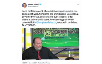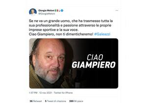 "Ci ha fatto vivere alcuni dei momenti più belli dello sport italiano: oggi ci lascia Gian Piero Galeazzi e noi vogliamo stringerci con affetto ai suoi cari, a cui va l'abbraccio di tutti i rossoneri", è il messaggio di cordoglio del Milan in un post sul profilo Twitter. "La voce dello Scudetto dei Record e di tanti altri successi, le interviste negli spogliatoi, la presenza fissa accanto ai nostri campioni nei momenti più importanti. Ciao Giampiero, tutto il Club ti ricorda con affetto, simpatia e infinita stima”, ha scritto invece l'Inter, in un tweet