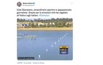 Anche il leader della Lega Matteo Salvini ricorda Galeazzi su Twitter: "Grazie per le emozioni che hai regalato all'Italia e agli italiani"
