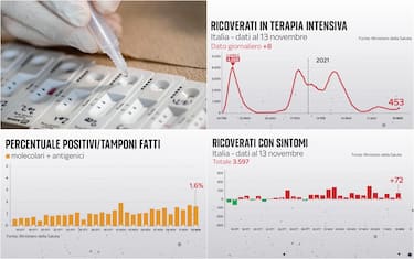 Nei reparti di rianimazione sale il numero dei pazienti Covid (453, cioè +8) e continua a crescere quello nei reparti ordinari (3.597, ovvero +72). La percentuale di positivi sui tamponi fatti è all’1,6%, in lieve calo rispetto all’1,7% di ieri. Secondo il bollettino del 13 novembre, ci sono 8.544 nuovi casi rilevati su 540.371 test giornalieri