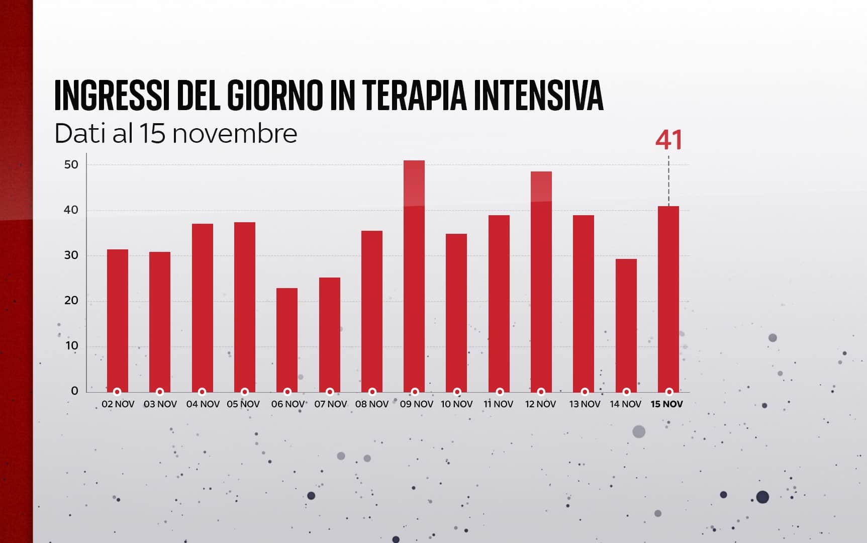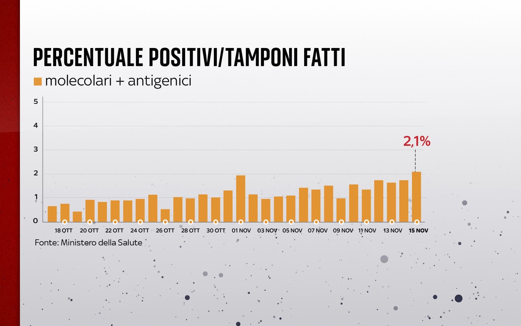 In Italia, dall'inizio della pandemia, le persone risultate positive al coronavirus, compresi guariti e deceduti, sono 4.865.260. Le vittime in totale sono 132.819, con 44 decessi segnalati nell'ultimo bollettino. I guariti sono 4.611.566 in totale. I ricoverati con sintomi sono 3.808 (+161). Sono invece 116.592 le persone in isolamento domiciliare. I tamponi sono in tutto 111.051.082 - di cui 64.929.977 processati con test molecolare e 46.121.105 con test antigenico rapido -, in aumento di 248.825 rispetto al 14 novembre. Le persone testate sono finora 36.911.565, al netto di quanti tamponi abbiano fatto.