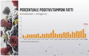 La percentuale di positivi considerando il totale dei tamponi è all’1,1% (ieri era al 2,1%)
