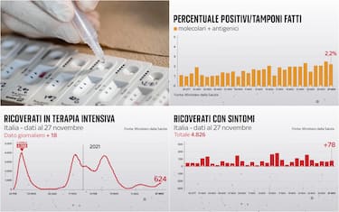 Salgono il numero dei pazienti nei reparti ordinari (4.826, +78) e quello delle persone in rianimazione (624, +18). Scende la percentuale di positivi sui tamponi fatti (ieri 2,45%). Il bollettino del 27 novembre segnala 12.877 nuovi casi rilevati su 596.898 test giornalieri