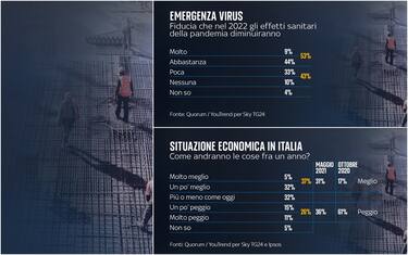 Gli italiani tornano ad avere un po’ di fiducia nel futuro, vedono un miglioramento della situazione sanitaria nel prossimo anno e sperano in un miglioramento della situazione economica, nonostante temano ancora gli effetti della pandemia sul sistema produttivo del Paese. Sono alcuni dei risultati emersi dal sondaggio realizzato dall'istituto di ricerca Quorum/YouTrend per Sky TG24. Il 53% degli intervistati ritiene che nel 2022 gli effetti sanitari della pandemia diminuiranno, contro il 43% che non ha fiducia che questo accada (non si esprime il 4%)
