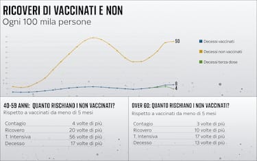 I decessi ogni 100mila persone ricoverate per coronavirus sono a quota 50 per i non vaccinati, numero che scende a 8 per i vaccinati e a 4 per chi ha ricevuto la terza dose. Nella fascia 40-59 anni chi non ha ricevuto alcuna dose rischia 56 volte in più il ricovero in terapia intensiva di un vaccinato da meno di 5 mesi
