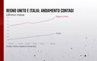 L’Europa è alle prese con la quarta ondata di coronavirus, alimentata dalla variante Omicron. Tra i Paesi che per primi hanno registrato il nuovo aumento dei contagi c’è il Regno Unito, ma poi anche gli altri - tra cui l’Italia - hanno dovuto fare i conti con le curve in risalita. Nel grafico, il confronto tra Italia e Uk riguardo all’andamento dei contagi nell’ultimo mese