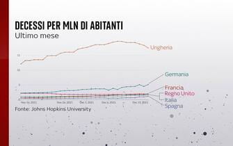 Allargando lo sguardo ad altri Paesi europei, ecco l’andamento dei decessi nell’ultimo mese per milione di abitanti