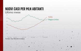 I nuovi casi per milione di abitanti, nell’ultimo mese, in Italia e Regno Unito
