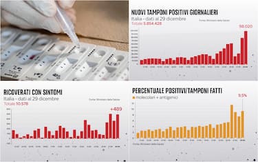Sono 98.020 i nuovi contagi di Covid-19 in Italia, nuovo record da quando quasi due anni fa è esplosa la pandemia. Ieri i casi erano stati 78.313. I tamponi giornalieri effettuati sono stati 1.029.429 (ieri erano stati 1.034.677, mai così tanti). La percentuale di positivi considerando il totale dei tamponi è al 9,5% (ieri era al 7,6%). Sono 136 le vittime registrate in un giorno, con un ricalcolo delle Regioni Sicilia, Campania, Lazio e Calabria. L'occupazione degli ospedali però tiene e i reparti non sono sotto pressione. Le terapie intensive sono 1.185 (+40 rispetto a ieri), con 126 nuovi ingressi nelle ultime 24 ore. È questo il quadro che emerge dal bollettino del Ministero della Salute del 29 dicembre sulla situazione coronavirus in Italia (AGGIORNAMENTI LIVE - SPECIALE - LA SITUAZIONE IN ITALIA CON MAPPE E INFOGRAFICHE - DATI E GRAFICI SUI VACCINI). Secondo la Federazione Italiana Aziende Sanitarie e Ospedaliere (Fiaso), a dicembre è stato segnalato un aumento pari al 46% tra i ricoverati non vaccinati mentre l’aumento dei vaccinati si è fermato al 19%. In terapia intensiva il 71% dei pazienti è no-vax.
