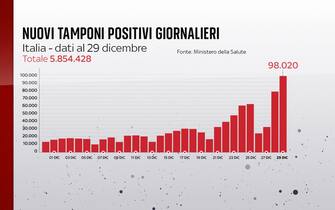Secondo il quadro che emerge dal bollettino del Ministero della Salute del 29 dicembre sulla situazione coronavirus in Italia, sono 98.020 i nuovi contagi di Covid-19 nel nostro Paese in 24 ore, nuovo record da quando quasi due anni fa è iniziata la pandemia. Ieri i casi erano stati 78.313