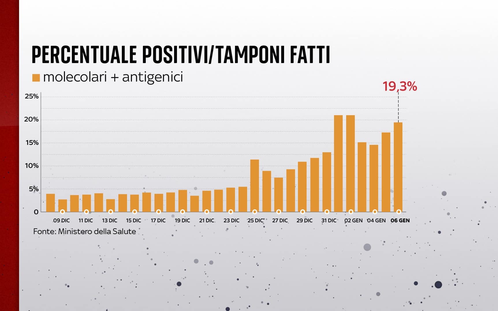 Nelle ultime 24 ore sono stati 219.441 i nuovi casi di coronavirus registrati in Italia, mentre ieri erano stati 189.109. I tamponi effettuati sono 1.138.310, contro 1.094.255 di ieri. La percentuale di positivi considerando il totale dei tamponi - quindi molecolari più antigenici rapidi - è al 19,3% (ieri era 17,3%). Sono 198 i morti (compreso qualche riconteggio). Sul fronte dei ricoveri - dato cruciale in questo momento per comprendere l'andamento della pandemia - sono 39 le persone in più in terapia intensiva, mentre nei reparti ordinari il numero di pazienti sale a 13.827 (+463). È questo il quadro che emerge dal bollettino del ministero della Salute del 6 gennaio (AGGIORNAMENTI LIVE - SPECIALE - GRAFICHE).