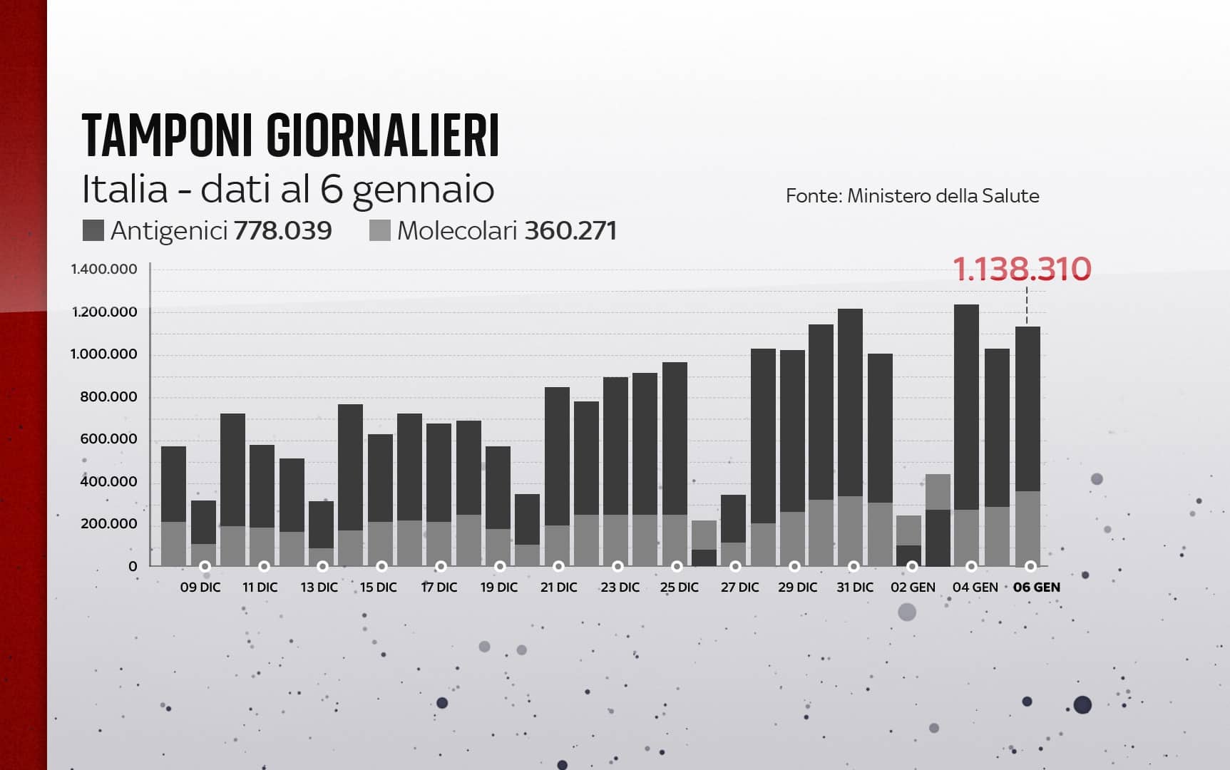 In Italia, dall'inizio della pandemia, le persone risultate positive al coronavirus, compresi guariti e deceduti, sono 6.975.465. Le vittime in totale sono 138.474, con 198 decessi segnalati nell'ultimo bollettino. I guariti sono 5.243.412 in totale. Sono invece 1.578.285 le persone in isolamento domiciliare. I tamponi sono in tutto 145.453.492 - di cui 75.023.110 processati con test molecolare e 70.430.382 con test antigenico rapido -, in aumento di 1.138.310 rispetto al 5 gennaio. Le persone testate sono finora 42.171.448, al netto di quanti tamponi abbiano fatto.