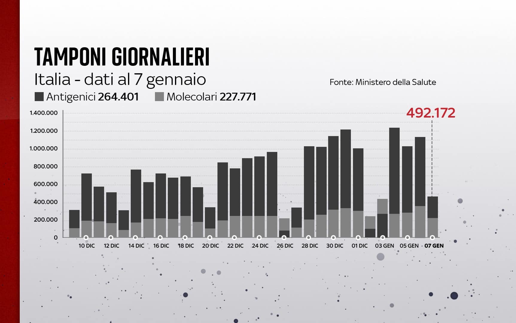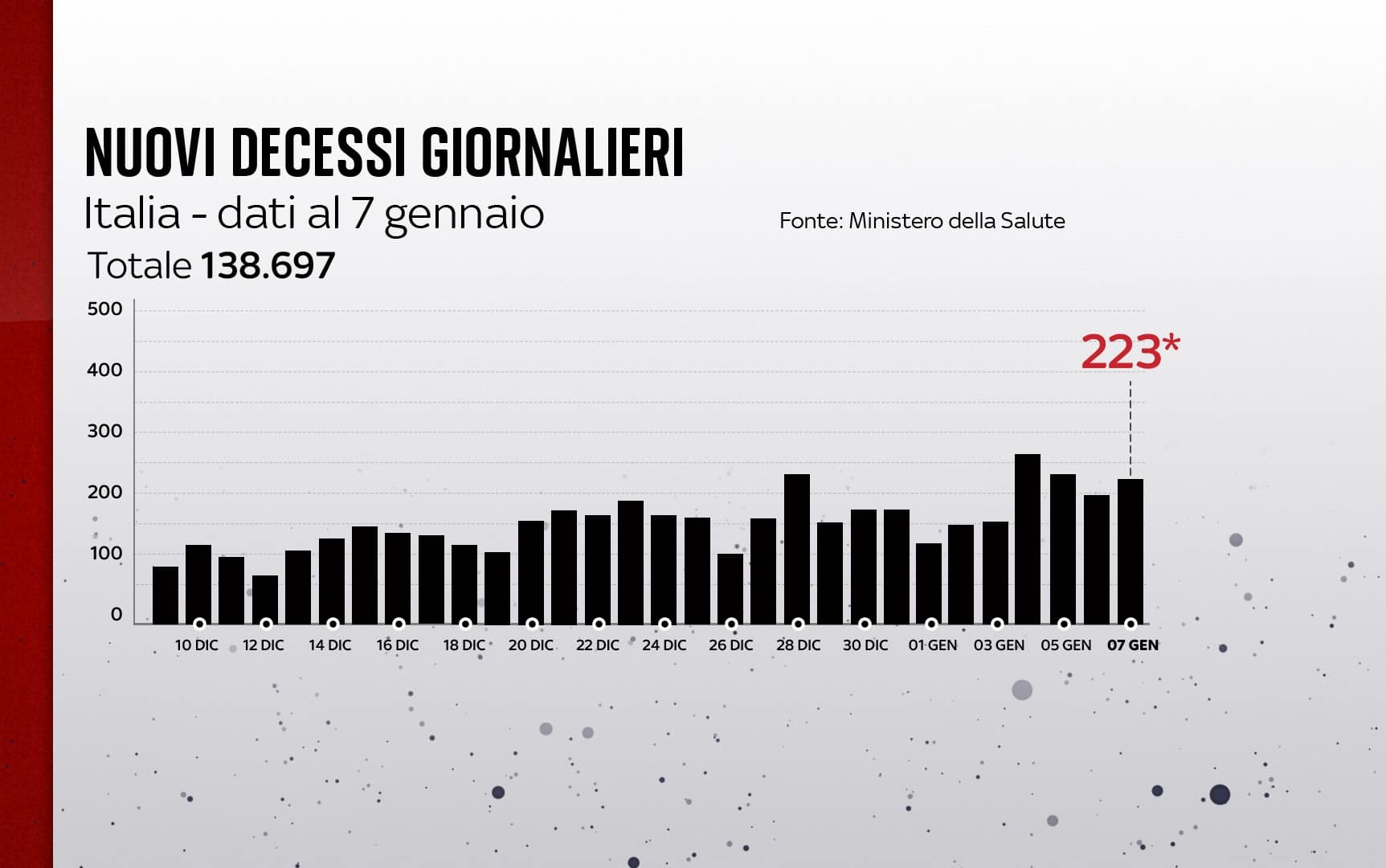 In Italia, dall'inizio della pandemia, le persone risultate positive al coronavirus, compresi guariti e deceduti, sono 7.083.762. Le vittime in totale sono 138.697, con 223 decessi segnalati nell'ultimo bollettino. I guariti sono 5.270.994 in totale. Sono invece 1.657.981 le persone in isolamento domiciliare. I tamponi sono in tutto 145.945.664 - di cui 75.250.881 processati con test molecolare e 70.694.783 con test antigenico rapido -, in aumento di 492.172 rispetto al 6 gennaio. Le persone testate sono finora 42.287.504, al netto di quanti tamponi abbiano fatto.