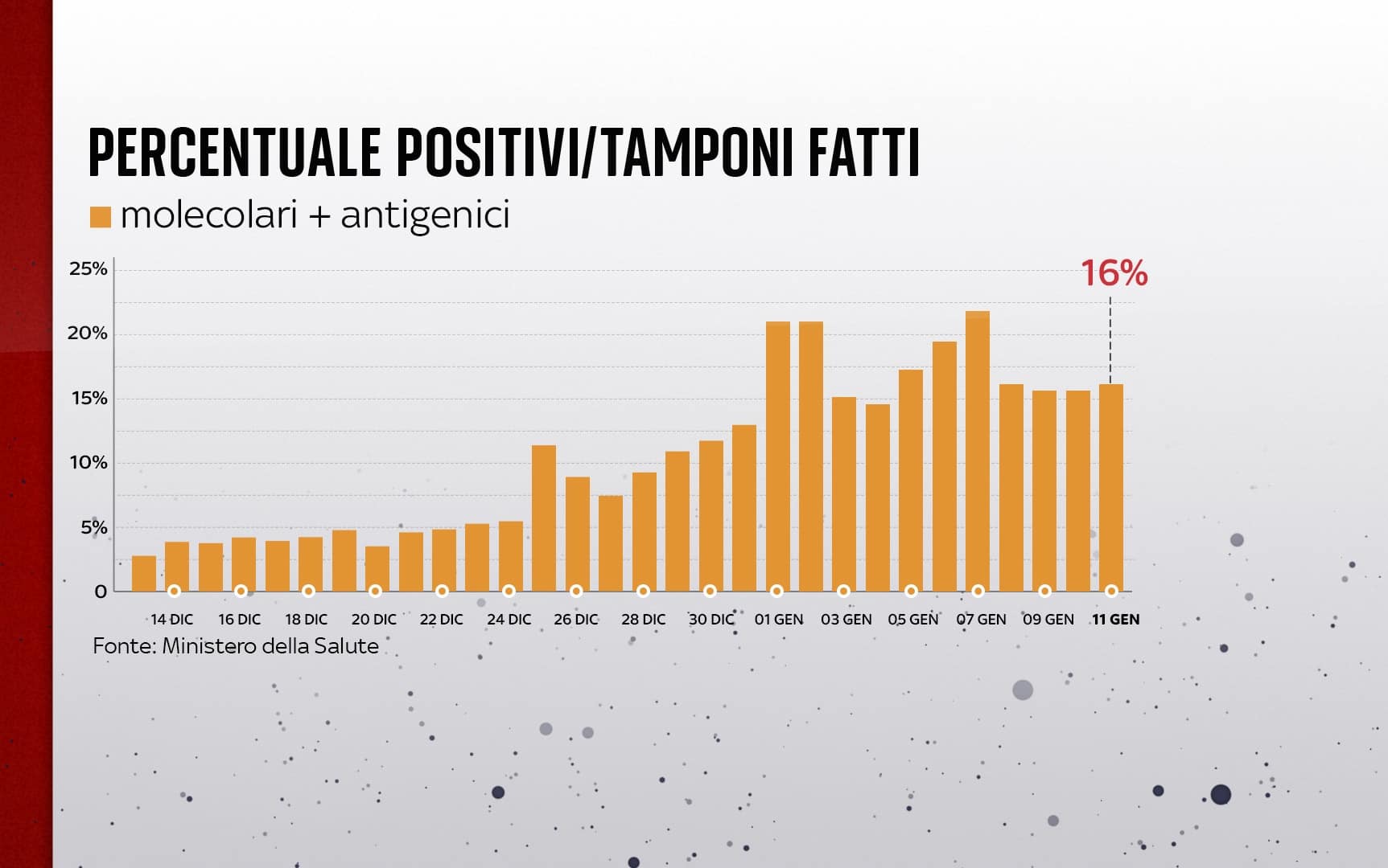 Nelle ultime 24 ore sono stati 220.532 i nuovi casi di coronavirus registrati in Italia, mentre ieri erano stati 101.762. I tamponi effettuati in un giorno sono 1.375.514 (ieri 612.821). La percentuale di positivi considerando il totale dei test - quindi molecolari e antigenici rapidi - è al 16% (ieri era 16,6%). Sono 294 i morti (compresi alcuni riconteggi), 71 i posti letto occupati in più in terapia intensiva rispetto a ieri. È questo il quadro che emerge dal bollettino del ministero della Salute dell’11 gennaio (AGGIORNAMENTI LIVE - SPECIALE). Sul fronte delle ospedalizzazioni - dato cruciale in questo momento per comprendere l'andamento della pandemia - i pazienti Covid ricoverati in terapia intensiva sono in totale 1.677, con 185 nuovi ingressi, mentre nei reparti ordinari sono 17.067 (+727). L'occupazione degli ospedali però tiene e i reparti non sono sotto pressione (LA SITUAZIONE IN ITALIA CON MAPPE E INFOGRAFICHE).