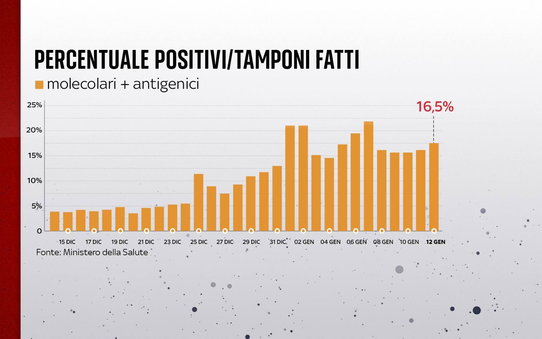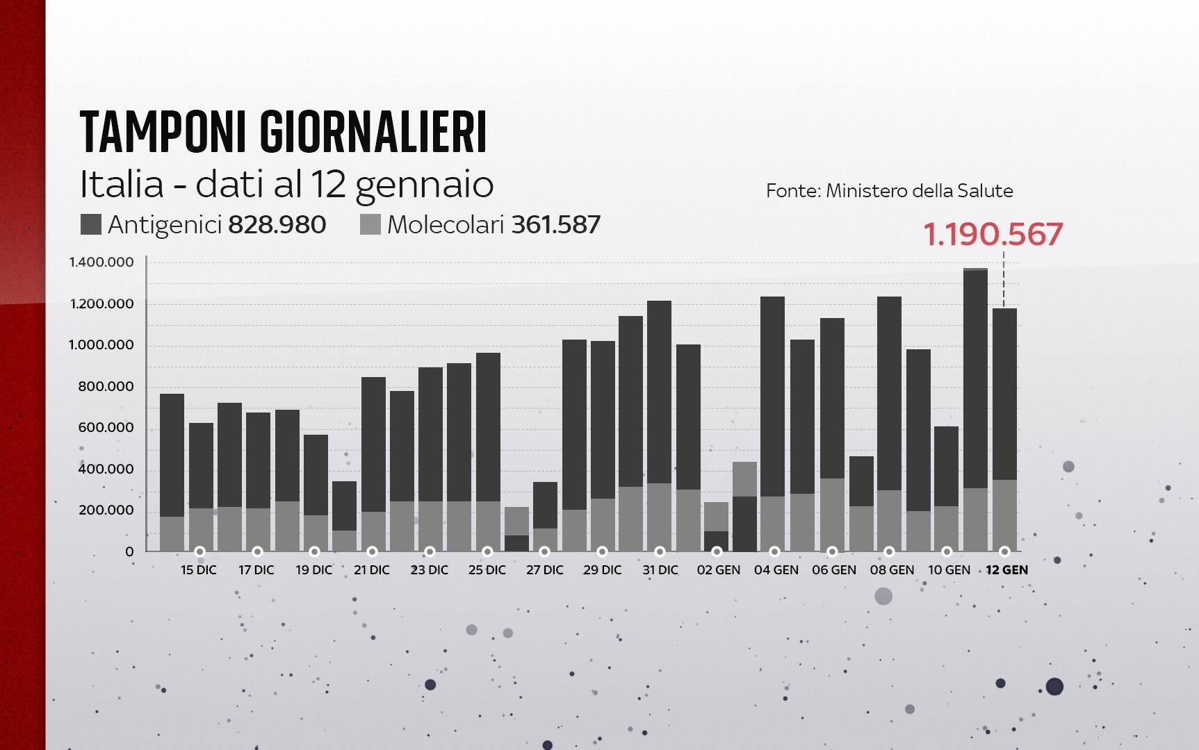 In Italia, dall'inizio della pandemia, le persone risultate positive al coronavirus, compresi guariti e deceduti, sono 7.971.068. Le vittime in totale sono 139.872, con 313 decessi segnalati nell'ultimo bollettino. I guariti sono 5.609.136 in totale. Sono invece 2.203.082 le persone in isolamento domiciliare. I tamponi sono in tutto 151.338.033 - di cui 76.764.844 processati con test molecolare e 74.573.189 con test antigenico rapido -, in aumento di 1.190.567 rispetto all'11 gennaio. Le persone testate sono finora 43.353.643, al netto di quanti tamponi abbiano fatto.
