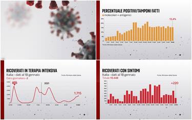 Aumenta il numero dei pazienti nei reparti ordinari (19.448, +220), scende leggermente quello delle persone in rianimazione (1.715, -2). Stabile la percentuale di positivi sui tamponi fatti. Il bollettino del 18 gennaio segnala 228.179 nuovi casi rilevati su 1.481.349 test giornalieri