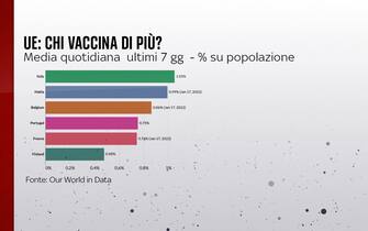 L’Italia, in questo momento, tra tutti i Paesi dell’Unione europea è quella che fa più vaccini in rapporto alla popolazione, considerando prime, seconde e terze dosi. Al secondo posto, tenendo conto della media quotidiana degli ultimi 7 giorni, c’è Malta