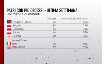 I Paesi del mondo con più decessi nell’ultima settimana e la loro percentuale di popolazione vaccinata