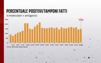 Resta invariato (1.685) il numero di persone positive al coronavirus ricoverate in rianimazione, secondo il bollettino del ministero della Salute. In 24 ore 77.696 nuovi casi, su 519.293 tamponi effettuati. Tasso di positività al 15%