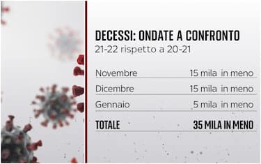 Con la campagna di vaccinazione il numero delle vittime è diminuito rispetto all'ondata di contagi di 12 mesi fa: novembre 2021 sono stati 15mila in meno rispetto allo stesso mese del 2020, stessa cifra fra dicembre 2021 e dicembre 2020. A gennaio 2022 se ne sono registrati 5mila in meno rispetto a gennaio 2021