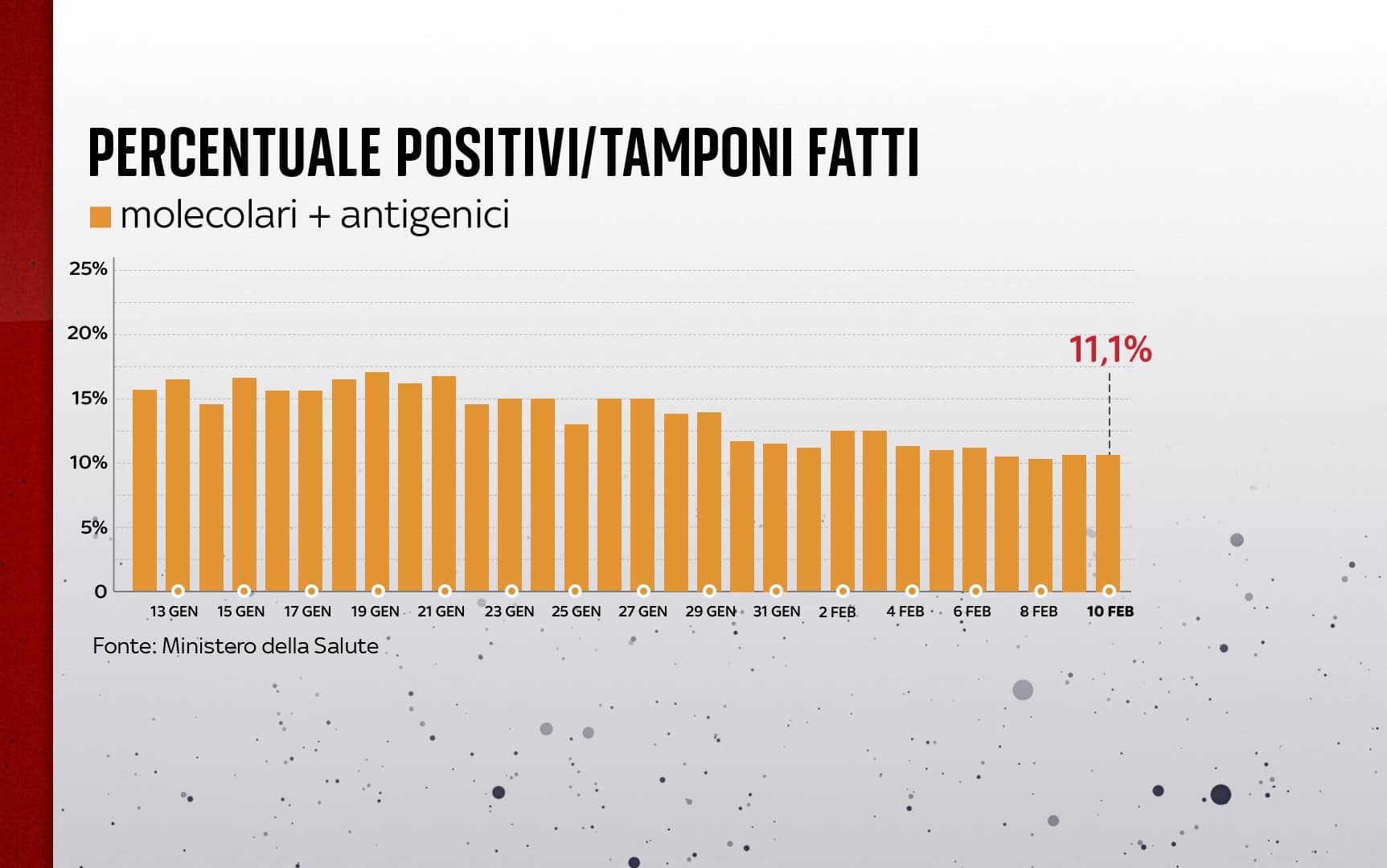In Italia, dall'inizio della pandemia, le persone risultate positive al coronavirus, compresi guariti e deceduti, sono 11.923.631. Le vittime in totale sono 150.221, con 325 decessi segnalati nell'ultimo bollettino. I guariti sono 9.960.136 in totale. Sono invece 1.794.598 le persone in isolamento domiciliare. I tamponi sono in tutto 178.984.246 - di cui 83.142.747 processati con test molecolare e 95.841.499 con test antigenico rapido -, in aumento di 683.715 rispetto al 9 febbraio. Le persone testate sono finora 49.937.792, al netto di quanti tamponi abbiano fatto.