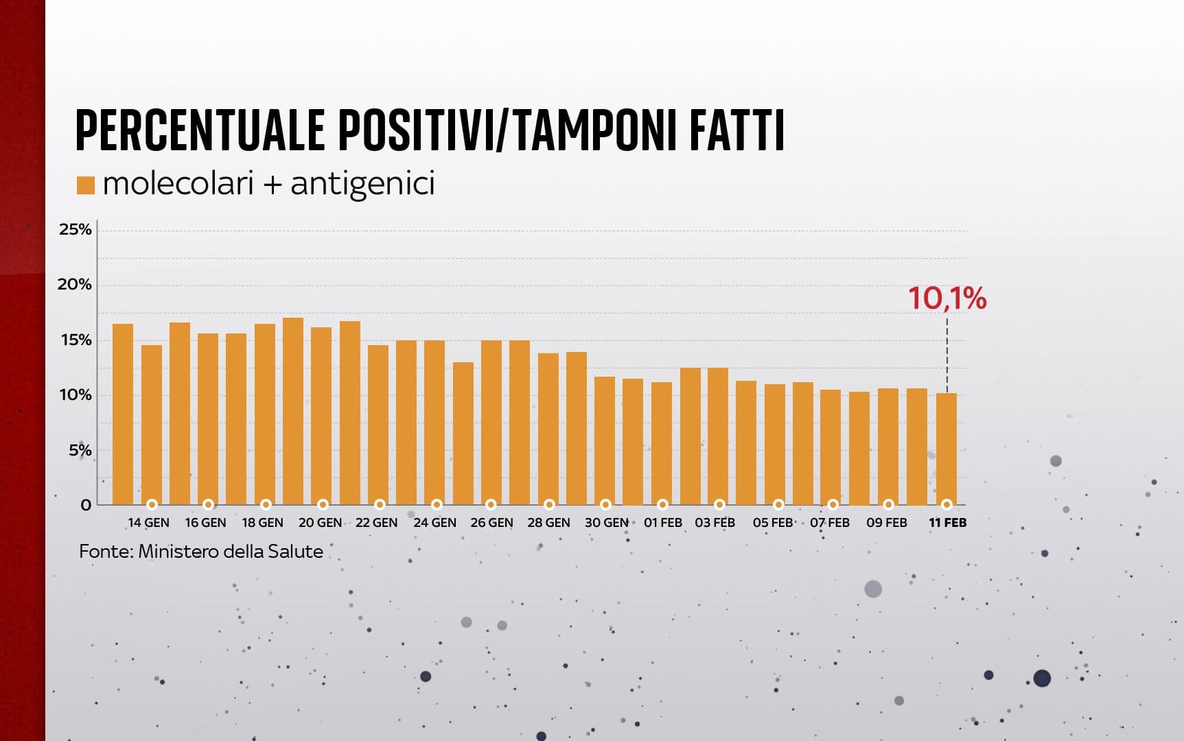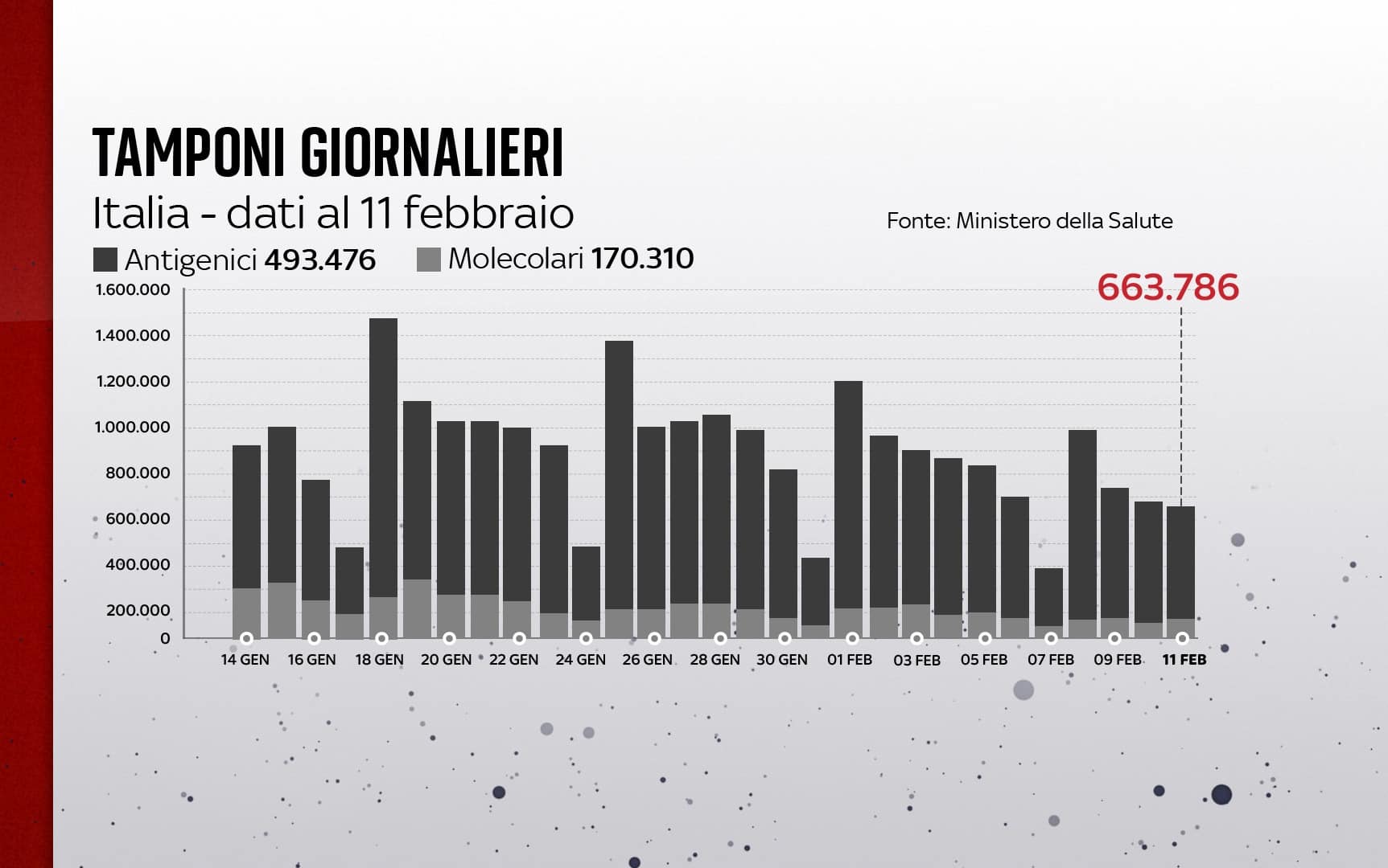In Italia, dall'inizio della pandemia, le persone risultate positive al coronavirus, compresi guariti e deceduti, sono 11.991.109. Le vittime in totale sono 150.555, con 334 decessi segnalati nell'ultimo bollettino. I guariti sono 10.089.429 in totale. Sono invece 1.733.036 le persone in isolamento domiciliare. I tamponi sono in tutto 179.648.032 - di cui 83.313.057 processati con test molecolare e 96.334.975 con test antigenico rapido -, in aumento di 663.786 rispetto al 10 febbraio. Le persone testate sono finora 50.046.103, al netto di quanti tamponi abbiano fatto.