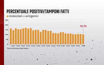 La percentuale di positivi su test fatti scende al 10,1% (ieri 11,1%)
