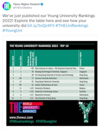 Tra le 790 migliori giovani università del mondo, cioè quelle fondate da meno di 50 anni e quindi con maggiori prospettive di crescita e di sviluppo, ci sono 17 atenei italiani. È quanto emerge dalla classifica 2022 "Times Higher Education Young University Rankings"