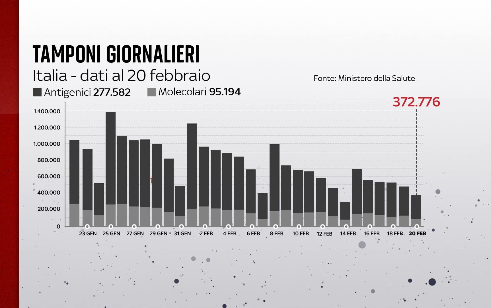In Italia, dall'inizio della pandemia, le persone risultate positive al coronavirus, compresi guariti e deceduti, sono 12.469.975. Le vittime in totale sono 152.989, con 141 decessi segnalati nell'ultimo bollettino. I guariti sono 10.968.639 in totale. Sono invece 1.334.129 le persone in isolamento domiciliare. I tamponi sono in tutto 184.146.508 - di cui 84.446.773 processati con test molecolare e 99.699.735 con test antigenico rapido -, in aumento di 372.776 rispetto al 19 febbraio. Le persone testate sono finora 50.853.494, al netto di quanti tamponi abbiano fatto.
