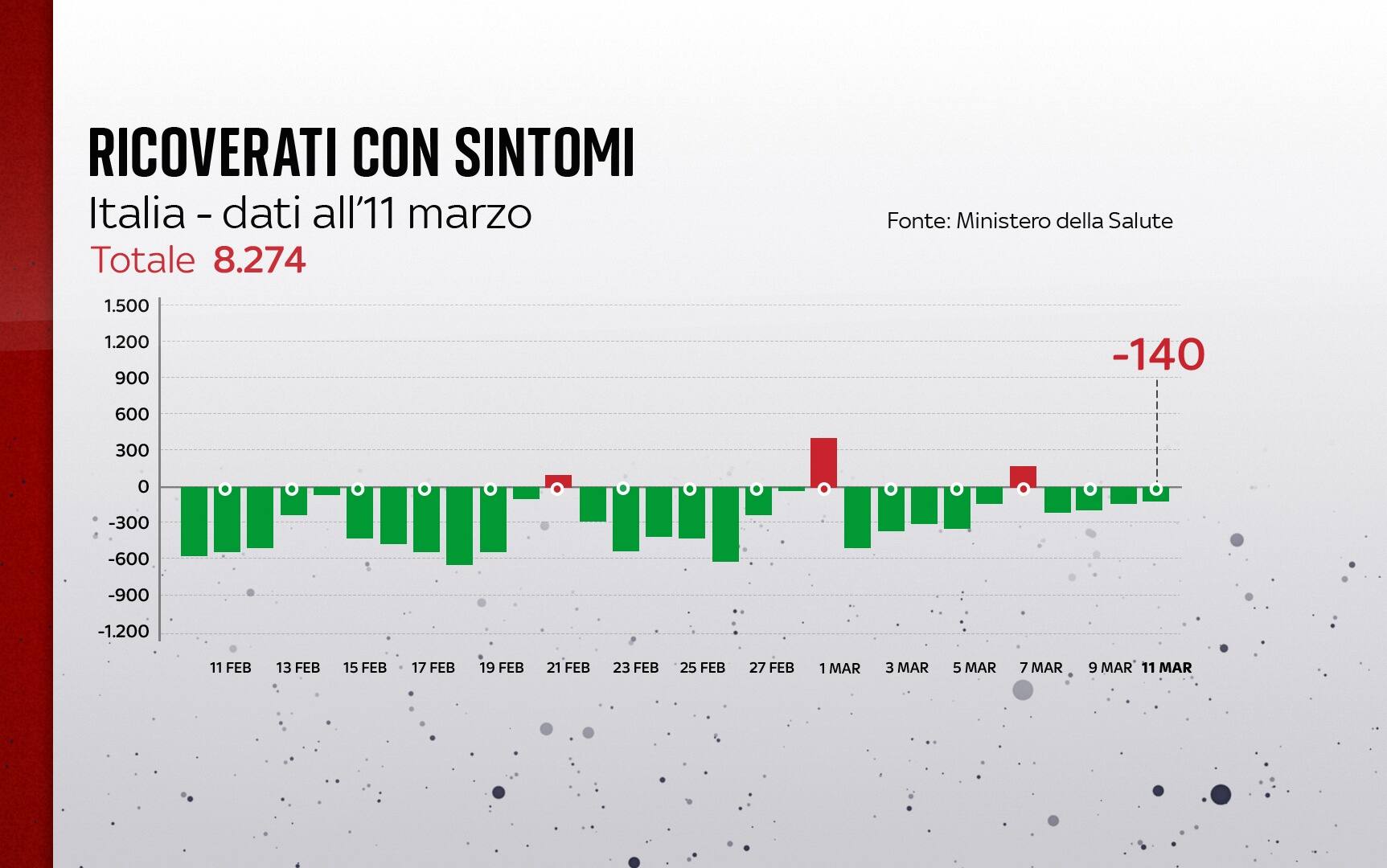 In Italia, dall'inizio della pandemia, le persone risultate positive al coronavirus, compresi guariti e deceduti, sono 13.268.459. Le vittime in totale sono 156.649, con 156 decessi segnalati nell'ultimo bollettino. I guariti sono 12.135.331 in totale. Sono invece 967.678 le persone in isolamento domiciliare. I tamponi sono in tutto 191.812.811 - di cui 86.355.379 processati con test molecolare e 105.457.432 con test antigenico rapido -, in aumento di 425.638 rispetto al 10 marzo. Le persone testate sono finora 52.350.045, al netto di quanti tamponi abbiano fatto.
