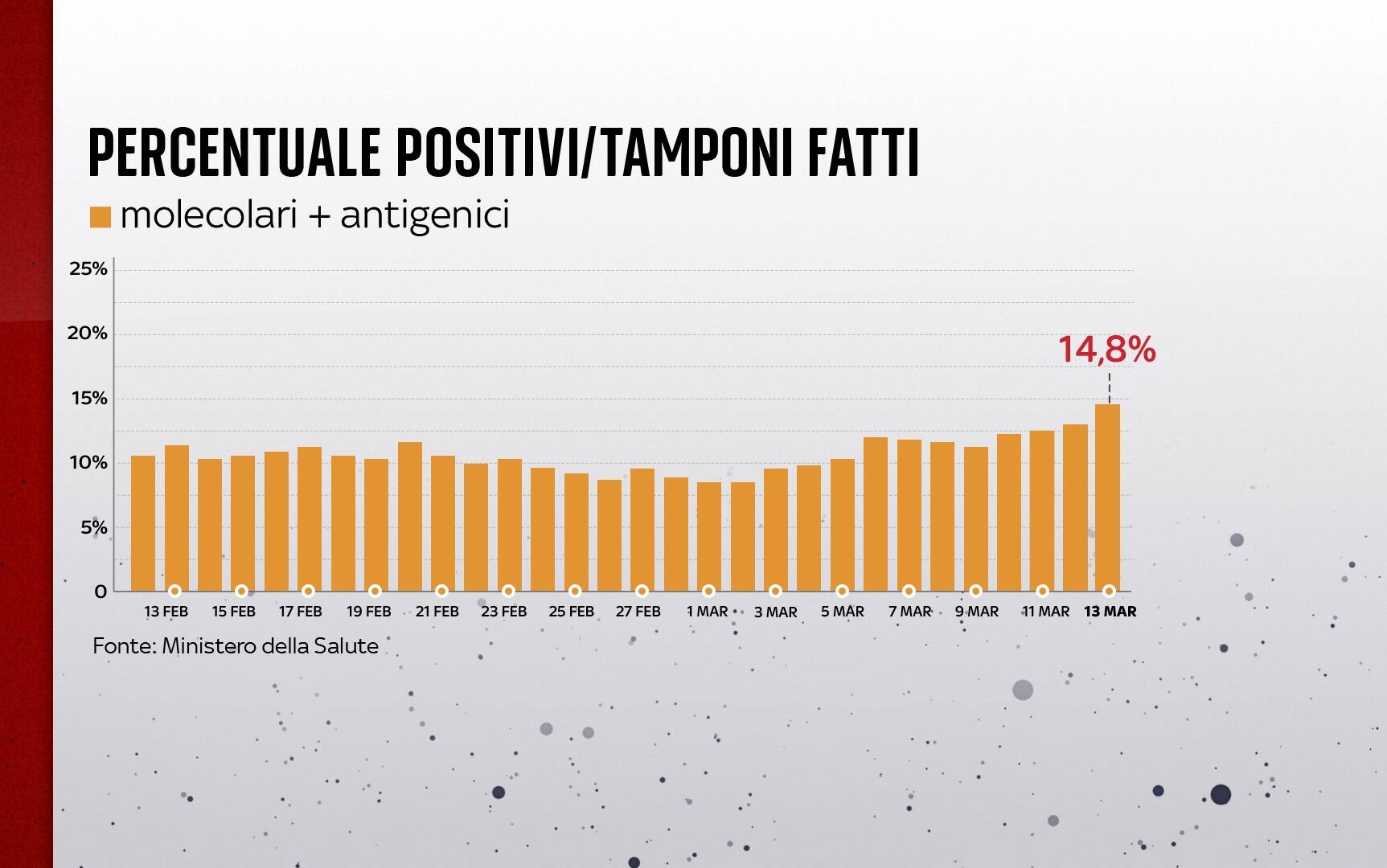 In Italia, dall'inizio della pandemia, le persone risultate positive al coronavirus, compresi guariti e deceduti, sono 13.373.207. Le vittime in totale sono 156.868, con 86 decessi segnalati nell'ultimo bollettino. I guariti sono 12.216.835 in totale. Sono invece 990.748 le persone in isolamento domiciliare. I tamponi sono in tutto 192.560.616 - di cui 86.531.713 processati con test molecolare e 106.028.903 con test antigenico rapido -, in aumento di 330.028 rispetto al 12 marzo. Le persone testate sono finora 52.519.706, al netto di quanti tamponi abbiano fatto.