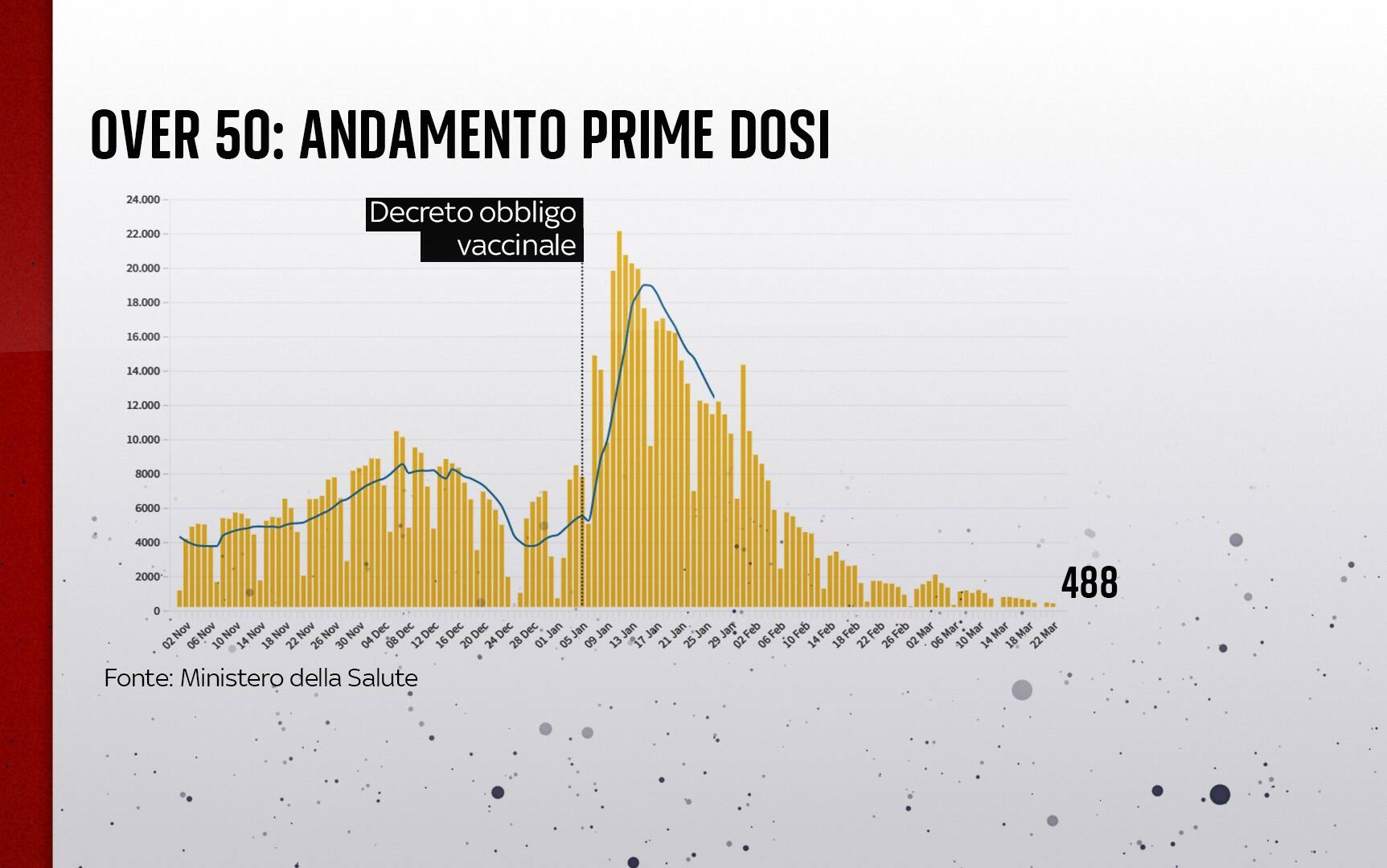In Italia, dall'inizio della pandemia, le persone risultate positive al coronavirus, compresi guariti e deceduti, sono 14.153.098. Le vittime in totale sono 158.436, con 182 decessi segnalati nell'ultimo bollettino. I guariti sono 12.748.859 in totale. Sono invece 1.236.327 le persone in isolamento domiciliare. I tamponi sono in tutto 197.631.659 - di cui 87.632.631 processati con test molecolare e 109.999.028 con test antigenico rapido -, in aumento di 545.302 rispetto al 23 marzo. Le persone testate sono finora 53.614.681, al netto di quanti tamponi abbiano fatto.