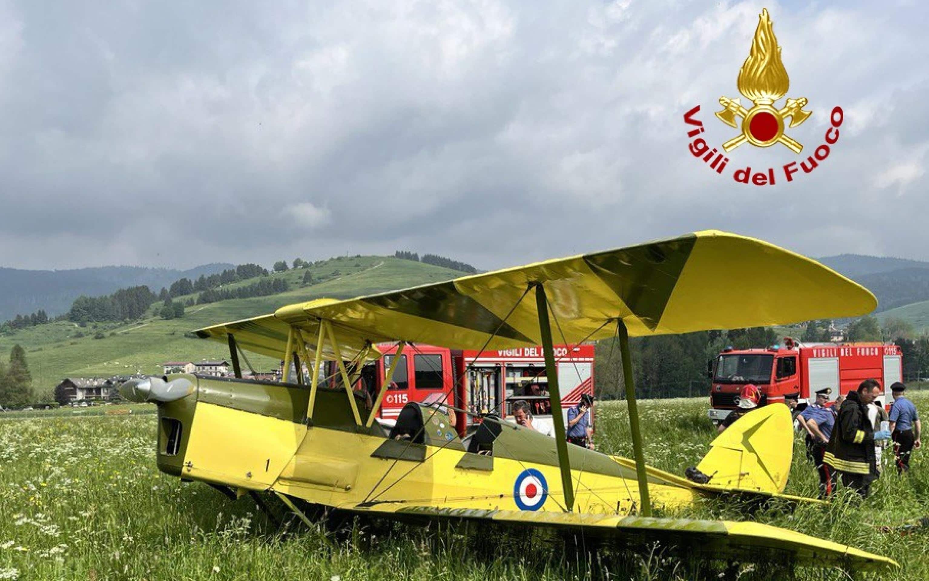 L'uomo è riuscito a portare in salvo il passeggero del suo biplano storico degli anni '30 Tiger Moth. E' accaduto all'aeroporto Romeo Sartori di Asiago dove il velivolo era stato affittato per le riprese di un film in lavorazione, dal titolo "L'isola che non c'è. La vera storia di Peter Pan", prodotto da Marco Paolini