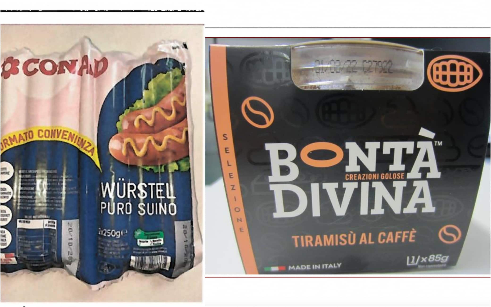 Il Ministero della Salute ha pubblicato sul suo sito (in data 12 agosto) due avvisi di richiami di prodotti alimentari da parte degli operatori. Si tratta del tiramisù al caffè “Bontà Divina” e del würstel Conad di suino (250 g). Nel caso del dessert al caffè sono stati segnalati frammenti di vetro all'interno. Invece per l'insaccato si tratta del rilevamento di pezzi di plastica e la notizia è stata data anche dalla Conad, essendo un suo prodotto.