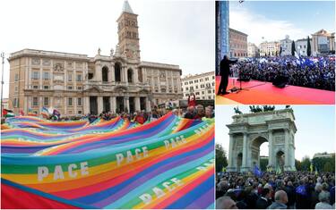 LA MANIFESTAZIONE A ROMA - La manifestazione di Roma è stata organizzata da sindacati e oltre 500 sigle di associazioni per chiedere il cessate il fuoco per il conflitto in Ucraina e per tutte le guerre attualmente in corso nel mondo. Moltissime le bandiere arcobaleno e gli striscioni, davanti alla basilica di Santa Maria degli Angeli ne è stato esposto uno con la parola "Pace" declinata dieci lingue